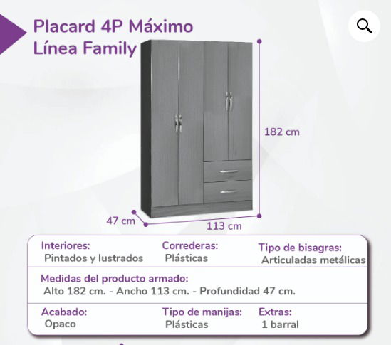 • Medidas: Alto: 182 cm Ancho: 113 cm Profundo: 47 cm