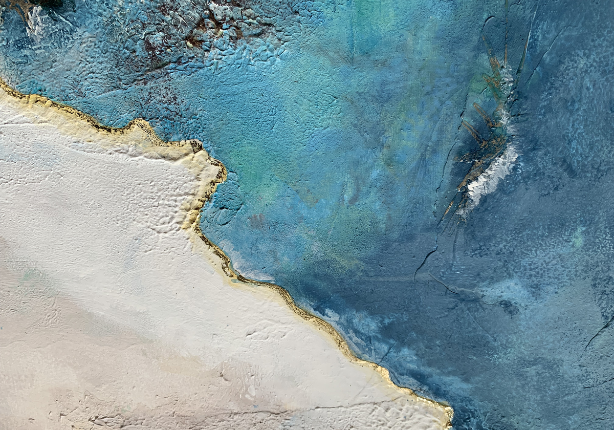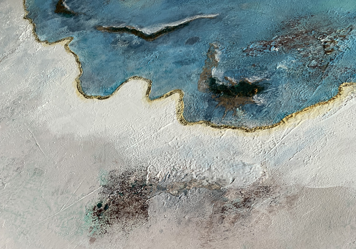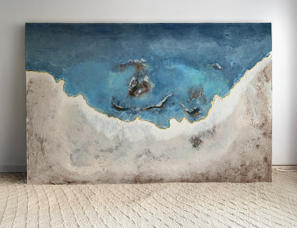 La combinación de colores vibrantes y formas fluidas en color azul y beige invita a la contemplación de un paisaje marino, aportando un aura de sofisticación a su hogar. No pierda la oportunidad de disfrutar de esta exclusiva obra de arte.